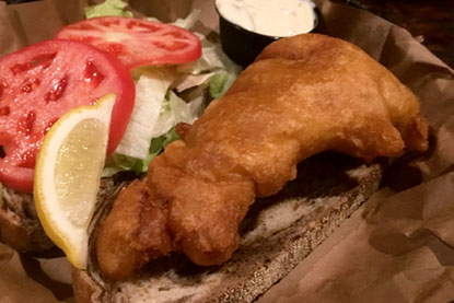 5oz beer battered Atlantic Cod on rye bread with lettuce and tomato. Served with jalapeño tartar sauce.